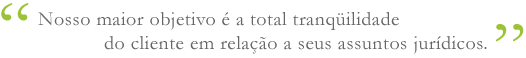 Baseados em uma atuação firme, uma equipe competente, motivada e devidamente instrumentalizada para a atividade, garantimos a nossos clientes total tranqüilidade em relação a seus assuntos jurídicos.